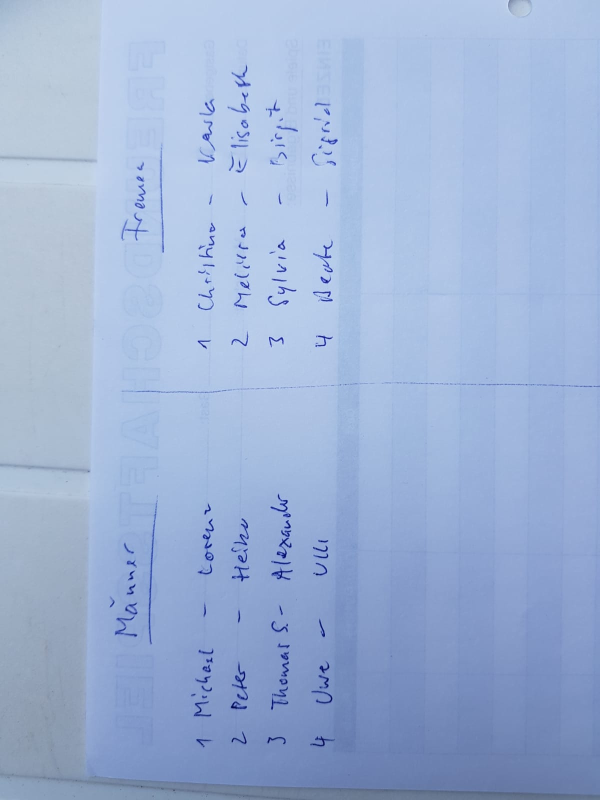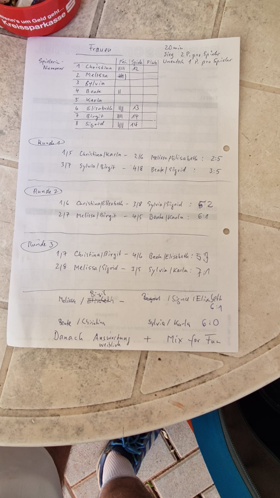 Am Ende siegte bei den Damen das Doppel aus Melissa und Birgit vor Elisabeth und Sigi. An der Paarung sieht man aber auch, dass Alt und Jung gemischt sich gut ergänzen konnten. Bei den Männern siegte sehr souverän das Doppel aus Heiko und Uwe vor Peter und Partner.