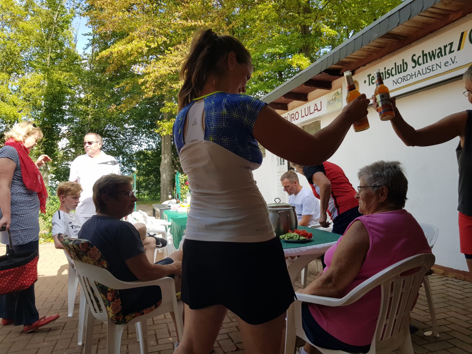 Mit all diesen leckeren Sachen waren die Bäuche schnell gefüllt. Da das Wetter einfach toll war und ausserdem noch 4 Kuchen auf ihren Verzehr warteten, wurde eine 2. Runde an selbst gewählten Paarungen im Einzel- und Doppelmodus eingeläutet. Gute 2 Stunden tolles Tennis wurde noch gespielt, bevor es zum gemütlichen Kaffeeklatsch ging, wo viele Dinge des Vereinslebens besprochen worden. Vielleicht haben wir nächstes Jahr im Rahmen der Punktspiele endlich mal wieder eine Damenmannschaft am Start. Der Ruf nach einem Trainer wurde auch wieder laut- sowohl für die schon spielenden Mitglieder aber auch für die interessierten Sportler aus Nordhausen und Umgebung, die vielleicht dann auch in unseren Verein eintreten würden.