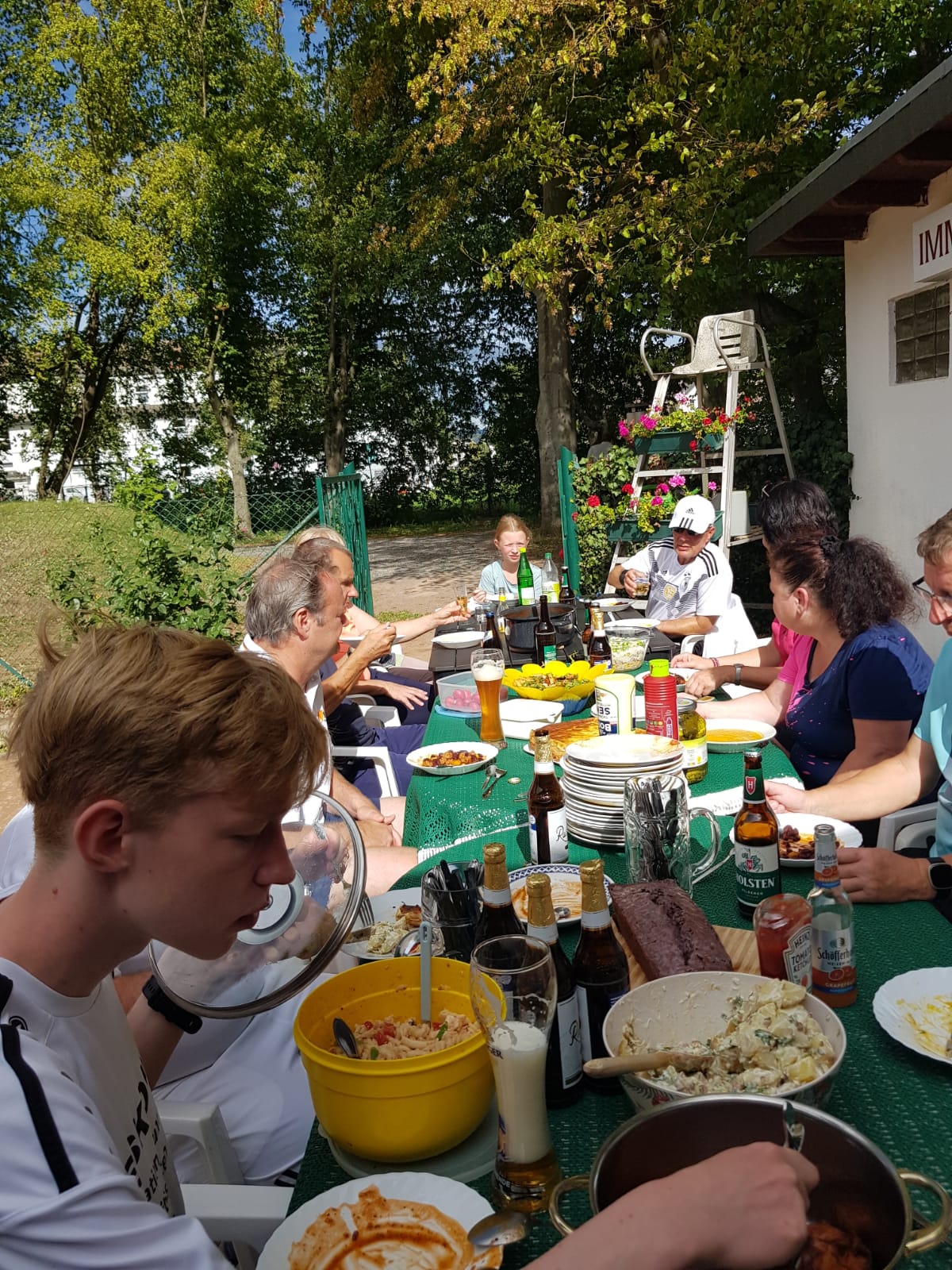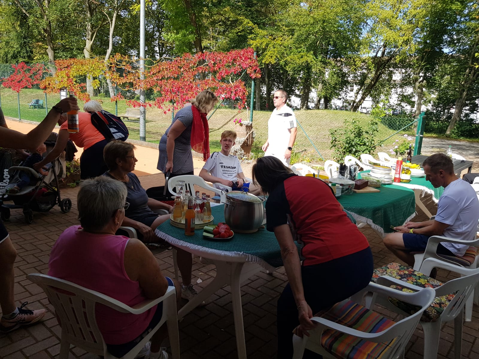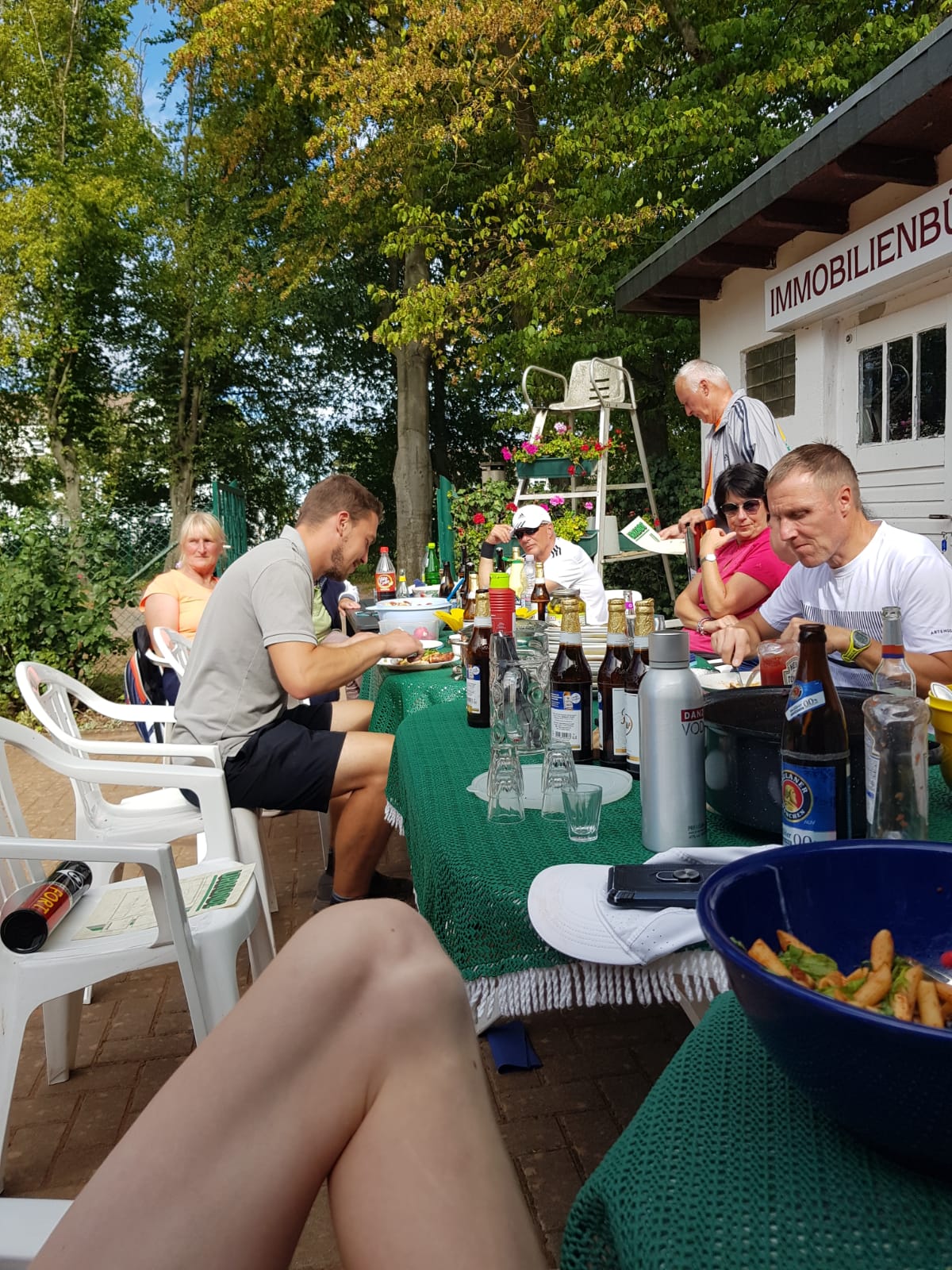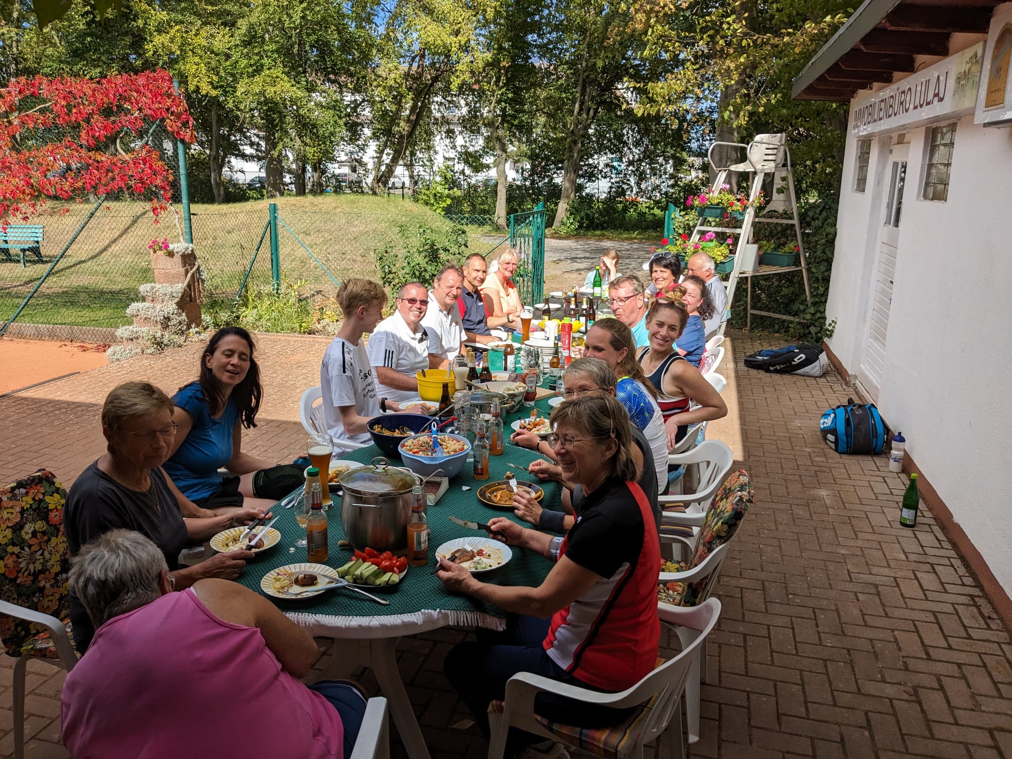 Und wer gut spielt, soll auch gut essen. Markus, der an diesem Tag nicht aktiv mitspielen konnte, da er als junger Vater Betreuungspflichten für den Nachwuchs hatte, zauberte auf dem Grill leckere Steaks und Bratwürste für alle anwesenden Mitglieder des Tennisvereins. Dazu gab es als Vorsuppe eine oberleckere Kürbissuppe von Birgit und eine Schüssel leckersten Chili con Carne von Luppi und anschließend die verschiedensten Varianten an Nudel- , Schicht- und Kartoffelsalat.