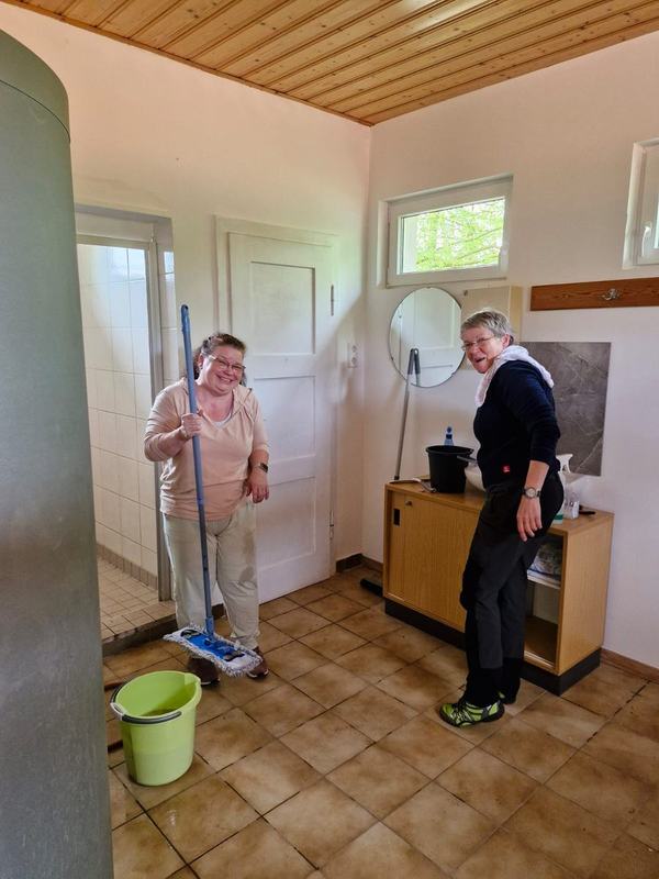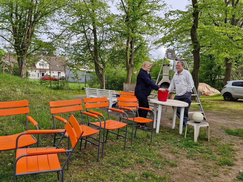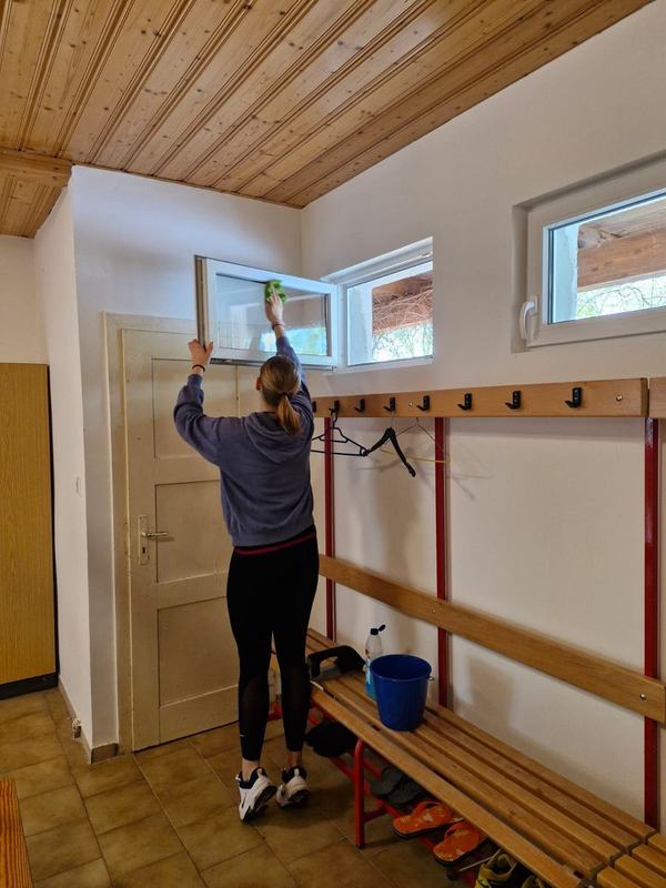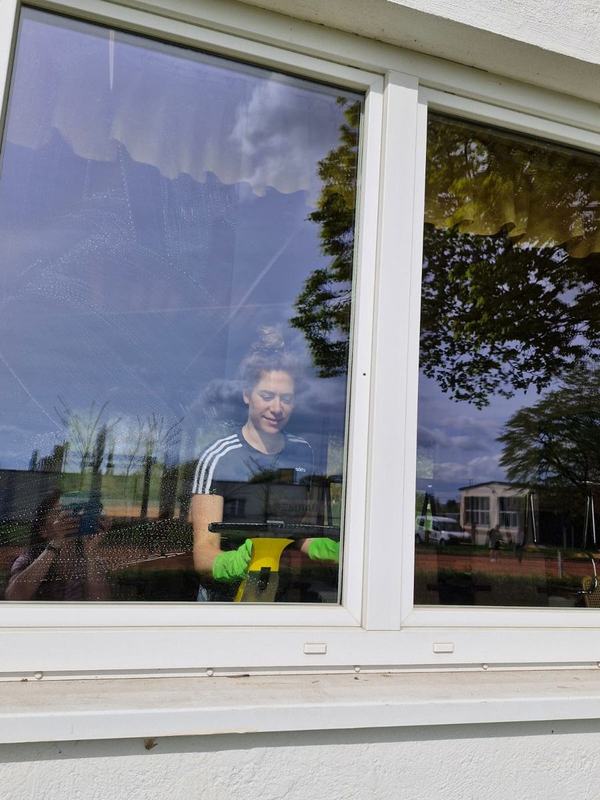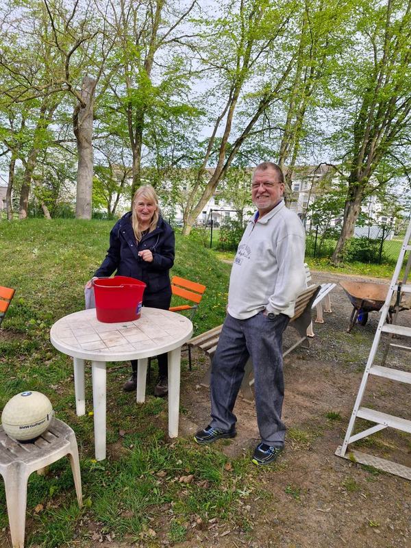 So wurde heute die Zeit genutzt, um die Linien auf Platz 6 zu entfernen, die Außenterrasse samt Stühlen zu kärchern und zu reinigen sowie das Vereinshaus zu putzen und auf Vordermann zu bringen. Es wurde um 10.00 Uhr nicht lange gefackelt, sondern sich an die Arbeit gemacht. Wasser und Schweiss flossen, die Putzmittel wurden fleißig genutzt und natürlich gab es viel zu erzählen. Schließlich hatten sich viele seit Oktober nicht mehr gesehen und da galt es Neuigkeiten auszutauschen.