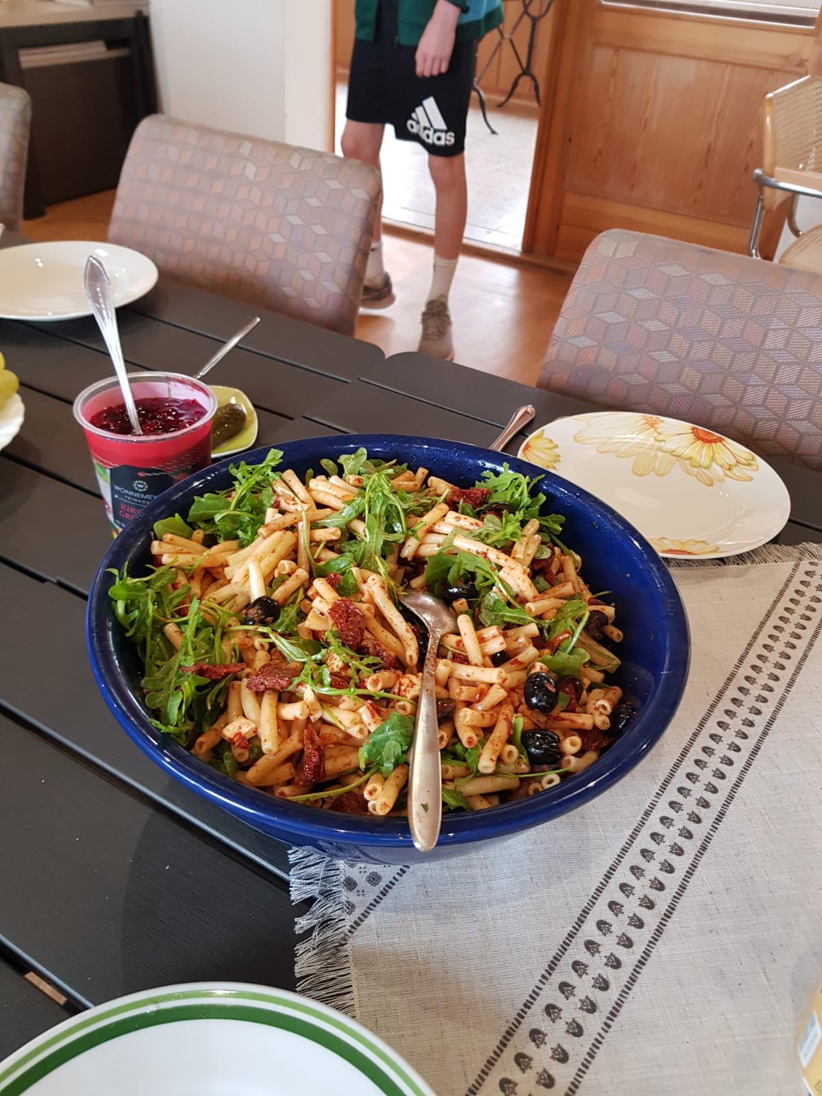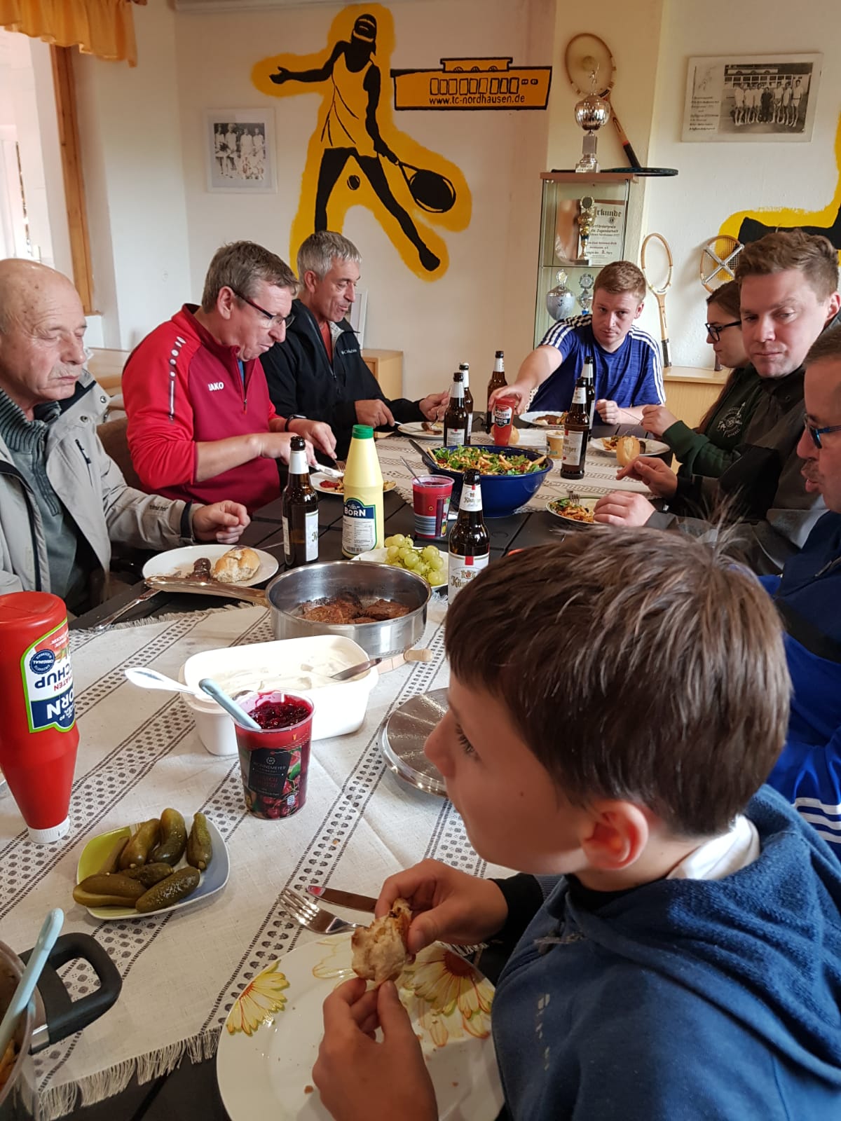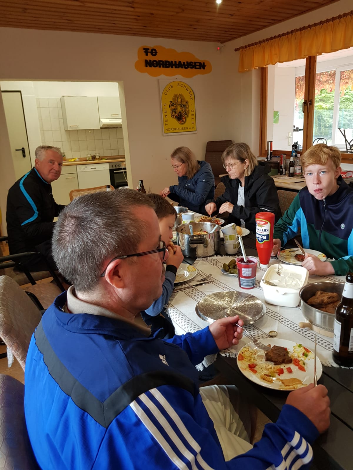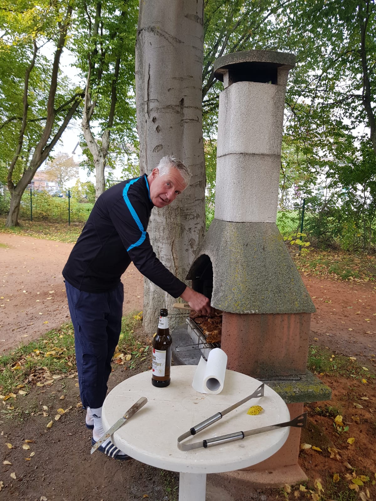 Dank Einkaufsgenie Alex und Grillmeister Thomas, der ohne Grillkohle zurecht kommen musste, gab es dann noch Leckeres vom Grill. Beate, Birgit und Christina ergänzten die Tafel mit Nudelsalaten, Quarkspeise mit Kirschgrütze, Weintrauben und sauren Gurken .