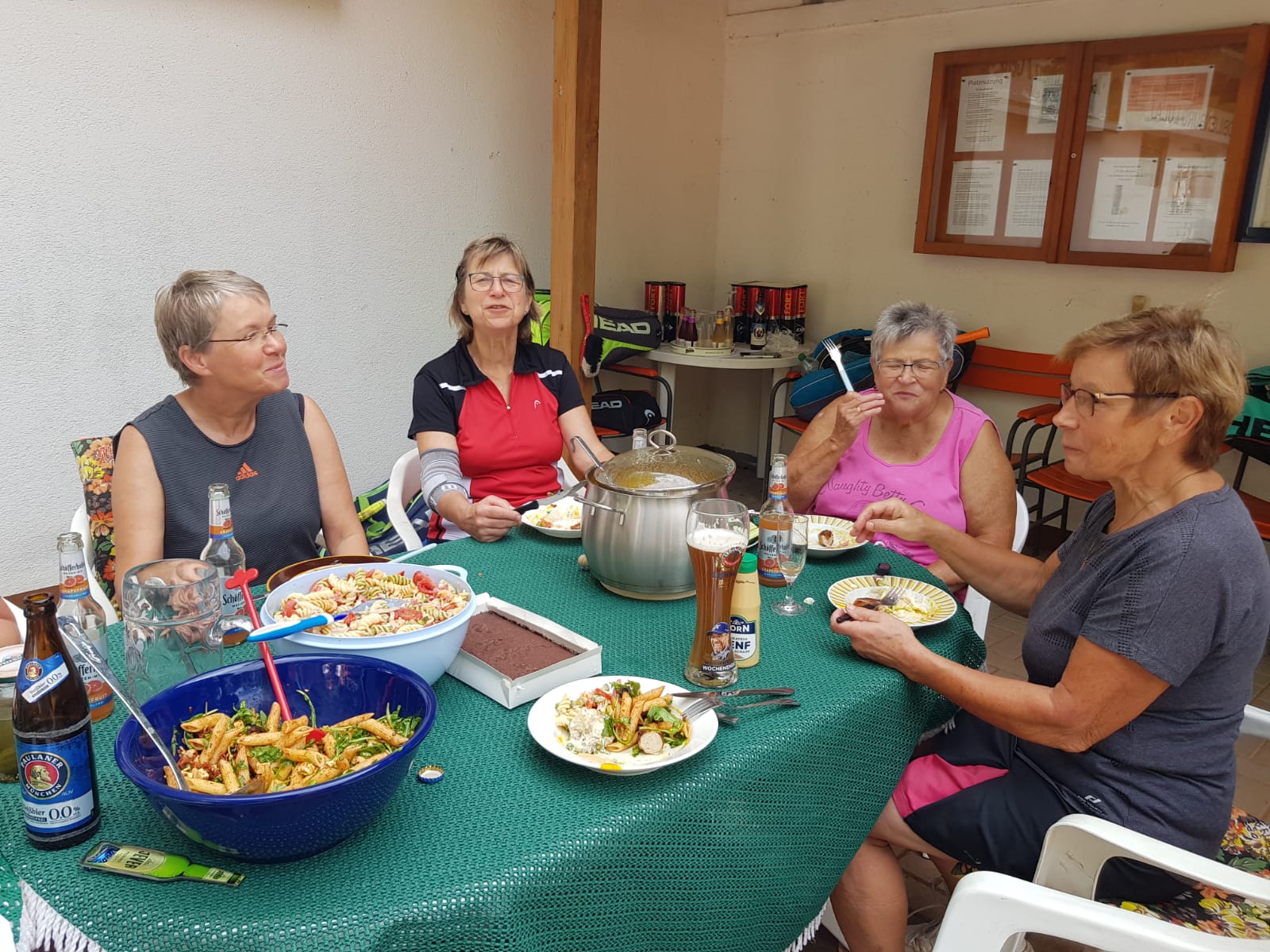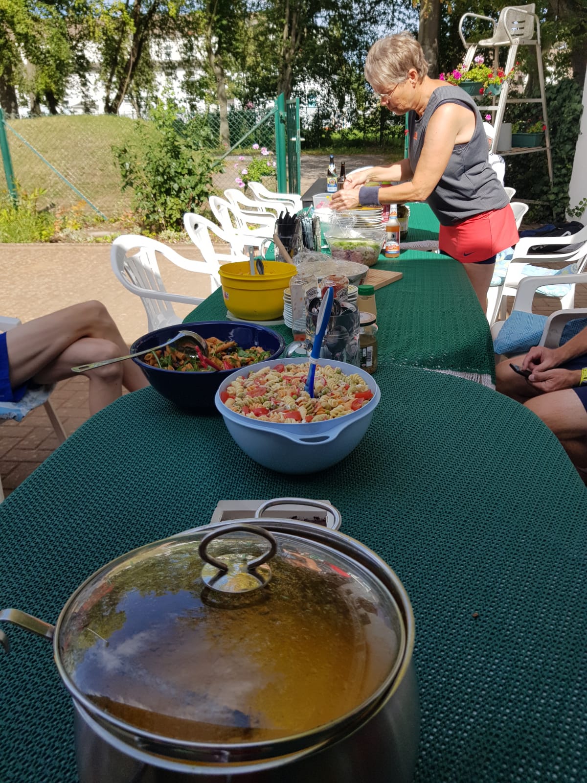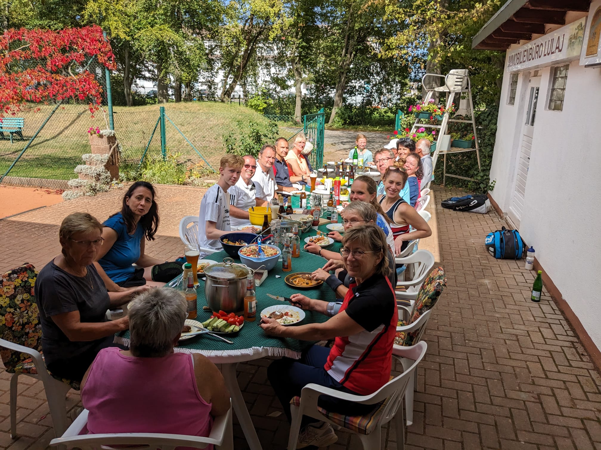 Und wer gut spielt, soll auch gut essen. Markus, der an diesem Tag nicht aktiv mitspielen konnte, da er als junger Vater Betreuungspflichten für den Nachwuchs hatte, zauberte auf dem Grill leckere Steaks und Bratwürste für alle anwesenden Mitglieder des Tennisvereins. Dazu gab es als Vorsuppe eine oberleckere Kürbissuppe von Birgit und eine Schüssel leckersten Chili con Carne von Luppi und anschließend die verschiedensten Varianten an Nudel- , Schicht- und Kartoffelsalat.